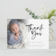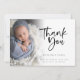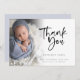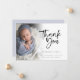 Photo Overlay Script Baby Boy Thank You Birth Announcement. Send the joyful news of your new baby son and say thank you at the same time with this minimalist photo design, with a beautiful set script for Thank You and the rest of the text on both sides is easy to personalise. Replace the sample photo with your own. A gradient overlay layer is on top of your photo so it fades out as it reaches the centre with the text partially overlaid on top. You can change the background colour on the back via customise further to another colour if better suits your image.