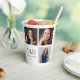 Photo Phd graduation paper cups with three photo templates. They are white with blue text that includes the grad's name, degree, and the year. Simply add your words and photos, add these cups to your cart, then celebrate your graduate's major accomplishment.