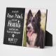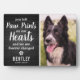 Plaque commémorative personnalisée pour animal de compagnie avec une photo de votre animal de compagnie bien-aimé, un fond en bois noir rustique et une citation de sympathie qui dit "vous avez laissé des empreintes de pattes dans nos cœurs et nous sommes à jamais changés", une empreinte de patte, un cœur, le nom de votre chien et les dates. Un beau souvenir et un hommage à votre précieux chien ou chat de compagnie.