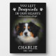 Une plaque commémorative pour animaux de compagnie qui porte la douce phrase 'vous avez laissé des empreintes de pattes dans nos cœurs et nous sommes à jamais changés'. Cette plaque présente un cadre rond aux bords doux pour la photo de votre animal de compagnie bien-aimé, son nom, ses dates et des empreintes de pattes. Un merveilleux cadeau ou souvenir pour quiconque a aimé et perdu un animal de compagnie.