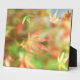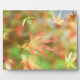 Sur fond de feuilles d'été verts d'une érablière japonaise poussant vers les rouges et les jaunes d'automne, une feuille de squelette rose et d'or dérive lentement vers le sol.