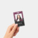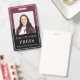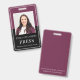 A modern photo press badge ID with name on burgundy red. .Simply add your photo and information. This version comes with a lanyard, but you may choose your style of attachment that includes, lanyard, metal clip or retractable, or no attachment.