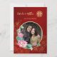 This elegant Chinese wedding invitation features a round photo surrounded by watercolor painted lotus flowers and a round gold double happiness symbol on a floral ruby red gold background. Bride and groom names in an elegant handwritten script. Chinese wedding invitation or tea ceremony invitation.