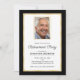 This photo retirement party invitation offers a sleek and professional layout, with a blackl border that is accented with a thinner gold border. Custom photo and text allows you to add a picture of the honoree and your retirement party details.