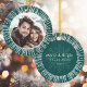 Pine green, round Christmas ornament featuring your custom photo inside a retro sunburst border. Customizable text "Merry & bright" on the back along with the family name and year.