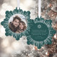 Pine green, snowflake shaped Christmas ornament card featuring your custom photo inside a retro sunburst border. Customizable text on the back.