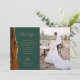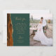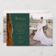 Send your family and friends a special wedding thank you with these custom photo cards. On the left, the words "thank you" appear in elegant gold-coloured handwriting script typography on a dark emerald green background over a brief, editable message of thanks to your wedding guests in copperplate font, with your names below. A burnt orange and rust watercolor agate border trimmed with faux gold glitter decorates the left edge. Easily add a vertical photo of the bride and groom to the right side. The back of the card provides space for a second, horizontal photo.