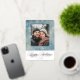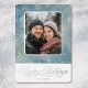 Partagez votre gaieté de vacances avec cette carte de vacances d'hiver ou de Noël au pays des merveilles, avec un arrière - plan de neige moderne turquoise et blanc glacé et un cadre rond en feuille d'argent pour votre photo de famille ou de couple préférée. Élégant script en feuille d'argent sur un arrière - plan blanc doux livre vos voeux de vacances, tandis que votre nom ajoute une touche personnelle. Créé par Simply Farmhouse Press.