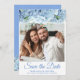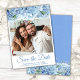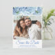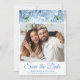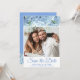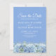 Blue periwinkle hydrangeas watercolor floral photo save the date card. Customize names, dates, and information.