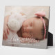 Modern baby photo birth keepsake free standing plaque. Simply use this template to add your own custom photo on the front and back of the card; of your own sweet baby and personalize with baby's name in the elegant trendy script typography.