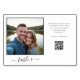 These photo table number cards with QR Code for photo sharing are perfect for your wedding reception! Simply choose a favourite photo of you to use with the table number below. This is a great way to ask guests to upload their photos of you to your wedding website. Your guests will love sharing their fabulous photos of your wedding and reception with you. It is so easy to make these cards your own. Simply select "Personalize this Template", upload your photo, type in your qr code URL, and type the table number then add to cart. Repeat for how every many tables you will be having at your reception.