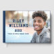 Graduation guest book featuring your photo and the graduate's name and school in a college sports font. Custom text on the spine. Fonts and colours are customizable.