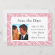 Dramatic white swirls frame this save the date beautifully; while the photo of the couple is highlighted with a very complementary shade of pink. This save the date is also available as a magnet and in several different colours.