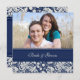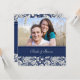 Wedding invitation custom photo cards in elegant dark navy blue and off white floral damask pattern. Customize these invitations with your wedding details and your own photo. Available in matching products for all of your wedding needs.
