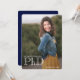 A photo PhD graduation announcement that includes your name, class year, a note of thanks, and more. The front of the announcement shows a vertical photo. The other side has a blue background. Swap out the photo, customize the words, add the announcement to your cart, and let everyone know that you accomplished something big.