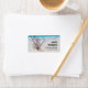 Address labels with a gorgeous photograph. Tropical blue water and foamy surf in the background. A collection of seashells and stems set on a white sandy beach.
