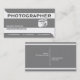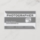 Photographer camera grey, white eye-catching business card featuring a photographer camera in white on grey and white stripes and the text Photographer. A great professional business card for the photographer or photography business and services.