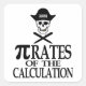 A skull with a gold tooth and eye patch wearing a pirates hat with two pens forming an "X" below it instead of the typical crossbones. On the hat is the number for "Pi" rounded to five numbers. Below the skull and crosspens is the phrase "Pi-rates of the Calculation" The letters "Pi" in the word Pi-rates has been replaced by the symbol for Pi.