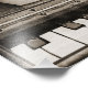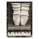A beautiful sepia toned still life photograph of ballet shoes en pointe atop an upright piano keyboard surrounded by a graphic polaroid-style border. The medium sized photographic print is 11 x 15 1/2 inches or 28 x 39 cm.