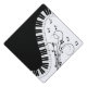 Classic black and white keyboard with a curved flair. Added music notes add a festive look.
