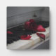 Artistic looking photo of an old piano focusing on the old yellowing keys with a faded red rose sitting on the keys and a few loose petals scattered about. This image has a somewhat melancholy and sentimental mood with a little bit of a nostalgic feel.