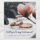 Romantic wine label featuring rose gold wedding bands on a piano, with a gorgeous magnolia flower and festive light sparkles.