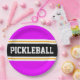 This sporty design features bold PICKLEBALL text inside a wide black horizontal centre racing stripe highlighted with twin floating white pinstripes against bright tropical pink outer stripes. The text can be personalized.