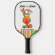 Pickleball bachelorette personalized pickleball paddle with red, green, orange, yellow pickleballs. Serve up a slice of tropical paradise with our Dinks and Drinks Pickleball Bachelorette Party invitation! Featuring a vibrant graphic of an orange coloured Hurricane Cocktail adorned with pickleballs shaped like lime slices, orange slices, and maraschino cherries, this collection is perfect for celebrating the bride-to-be's last swing before the ring or gathering your favourite pickleball pals for a smashing good time. From eye-catching invitations to matching napkins, plates, cups, and wine glasses in shades of orange, lime green, and cherry red, our collection has everything you need to make your bachelorette bash unforgettable.