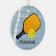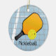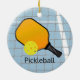 Pickleball Design Ornament avec du texte personnalisable des deux côtés. Le Pickleball est un sport de raquette et de pagaie qui a été créé en combinant des éléments de plusieurs autres sports de raquette. Deux ou quatre joueurs utilisent des pagaies solides pour frapper une boule de polymère perforée (comme une boule de torsion) sur un filet.