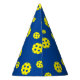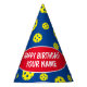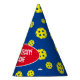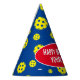 Pickleball Birthday party hats with custom name. Funny paper cone hats with yellow ball print and custom text. Sports themed party supplies and celebration accessories for children or adults. Create a fun surprise party for player, coach, mom, dad, girl, boy, friend, team, trainer, kids etc. Customizable colours and text template.
