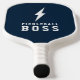 This simple, trendy pickleball paddle features a lightning bolt and collegiate typography reading Pickleball Boss. The back contains text templates for monogram initials and a name, making it a perfect, personalized gift! The background colour can be customized to any colour you'd like!