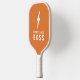 This simple, trendy pickleball paddle features a lightning bolt and collegiate typography reading Pickleball Boss. The back contains text templates for monogram initials and a name, making it a perfect, personalized gift! The background colour can be customized to any colour you'd like!