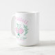 This pickleball mug has a pink and green line art image of pickleball paddles and a martini glass surrounded by laurel branches with the phrase "Pickleball Cocktail Club, Please Dink Responsibly." Colours used include green and pink.