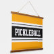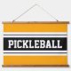 This sporty design features classic strong bold big letters inside a highlighted wide black stripe with adjoining double white stripes against a bright yellow background with "PICKLEBALL" spelled out inside the centre stripe. The colours and text in this design can be personalized.