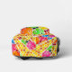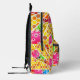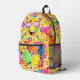 Colourful, sunny, pickleball court gear bag backpack. Pickleball is a court sport for any age and athletic ability. Between the dinking, banging and long rallies lifelong friendships are forged. Super colourful graphic with pickleball balls, yellow, orange honeycombs, hexagon shapes, and a big yellow pickleball wearing sunglasses and smiling.