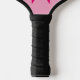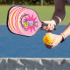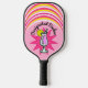 A pink cocktail, could be a watermelon, strawberry, raspberry margarita, or other exotic fruity drink. A yellow pickleball ball replaces the decorative fruit wedge at the top of the glass. The words Designated Dinker form an arch above the pink cocktail and a yellow, pale pink, hot pink and white rainbow arch reaches to the top of the pickleball paddle. Personalize with a name on the glass.