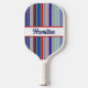 Personalized red, white, and blue pickleball paddle. Colourful, patriotic, stripes in a variety of fun patterns - polka dots, stripes, herringbone, zigzags - fill this fun pickleball paddle to personalize with your first or last name or pickleball nickname. Colourful pickleball paddle gift to customize for your pickleball-loving mom, dad, uncle, aunt, brother, sister, neighbour, grandpa, grandma, husband, wife, friend, or work colleague who won't stop talking about pickleball.