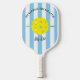 Fun Pickleball Social Club custom pickleball paddle with a blue striped background. All text can be personalized. Add your team name and your name or nickname like Big Dill and established in year. Preppy cabana stripes form the background with a yellow pickleball at the centre. Let your paddle reflect your personality on the court. Whether you're dinking with finesse or dominating the net, this paddle combines performance with undeniable flair for the stylish pickleball enthusiast.
