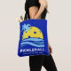 Custom Tote bag featuring a pickleball "sun" framed by a tropical palm tree and blue ocean waves. Add 2 lines of custom text to personalize. Nice and roomy so it will fit a lot of pickleball gear. Makes a great gift for pickleball players, teams/clubs, organizers and more.