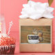 A picture of a chipmunk sitting on a latte coffee mug against a brick background. The coffee mug is black and white with white circles on the black background. The chipmunk is sitting on the mug with his curl tailed around the handle. There are appealing patterns of stripes and circles in this wildlife photograph. If you like chippies (or you like coffee!), you'll love this cute chipmunk picture which can be easily customized and printed on many different photo products. Join me in a cup of coffee?