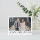 Send our landscape photo save the date postcards with a white border to let your guests know to block off your wedding date. Tip: if you need to change the wording that is in the script font, you can go to the "Personalize This Template" section then click the "Click to Customize Further" at the bottom. You can delete any of the text images that you need to and add your own text in its place with the "Add Text" button. Be sure to check out our large selection of photo save the date cards, postcards, and magnets by browsing our Picture Save the Date collection!