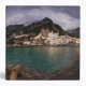 A beautiful photograph of the charming picturesque amalfi coast in italy with the picturesque seaside town in full view below the mountains. The photo has a stormy moody feel.