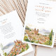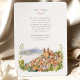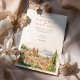 Invite your guests to a romantic celebration with this enchanting watercolor wedding invitation, showcasing the beautiful lakeside town of Valle de Bravo, Mexico. The artwork exquisitely captures the Parroquia de San Francisco de Asís, with its warm terracotta and ochre hues, nestled among a cluster of white and cream-coloured colonial houses with traditional terracotta tiled roofs, all cascading down a hillside towards the serene lake (Lake Avándaro). Distant hazy blue mountains complete the scenic backdrop. The scene is brought to life with touches of lush greenery, including tall, dark green cypress-like trees, muted green prickly pear cacti, and various green bushes. Rendered in a soft, romantic watercolor style, this invitation is perfect for a destination wedding in Mexico or for couples who appreciate picturesque lakeside towns and colonial charm. The front elegantly presents your wedding details, while the reverse side offers "The Finer Details" for guest information and often features stylized green leafy sprigs framing the text. The colour palette includes warm terracottas, ochres, creams, whites, various shades of green for the foliage, and soft blues for the water and distant mountains.