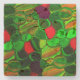 Stamp with the design of pieces of colourful shapes in striking colours and shades that change from orange to brown, some shades similar to gold, green going to yellow, almost circular shapes.
