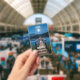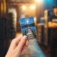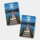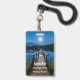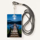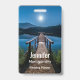 A name tag with a beautiful photograph of a wooden pier stretching out over a calm lake.