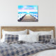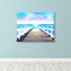 Canvas in an illustration of a pier, fenced in white, extending toward an aquamarine sea, under a pink tinged dawn sky