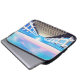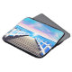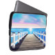 Laptop sleeve in an illustration of a pier, fenced in white, extending toward an aquamarine sea, under a pink tinged dawn sky