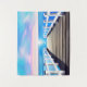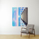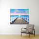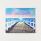 Tapestry in an illustration of a pier, fenced in white, extending toward an aquamarine sea, under a pink tinged dawn sky