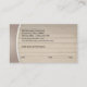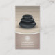 Ce carte de visite de spa exsude la sérénité. Trois pierres de massage sont empilées sur une surface en bois propre coordonnant avec un panneau incurvé de taupe ci-dessous. La raison sociale est augmentée par un ornement du soleil avec un site Web ou un numéro de téléphone ci-dessous. Les panneaux en bois sont répétés sur l'inverse pour montrer toute l'information de contact plus un secteur pour des rappels de rendez-vous. L'ornement du soleil peut être remplacé par votre propre logo ou toute autre image si désiré. Disponible dans des couleurs alternatives avec les produits assortis.