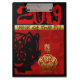 In a square are 2 pigs: one (black papercut Chinese style) seems to come sniff a golden papercut shape (inside is the second pig with the Chinese symbol). Behind them there is a red background formed by large decorative and ornamented letters with the words: "Pig Year" and at the top "Year of the Pig" + large 2019. Design on clipboard with black background. You can easily change year (font, colour, size and position) by clicking the customize button. Matching office products, home products, greeting card, postcard, craft products and more. Perfect for Chinese New Year 2019 of the Pig or birthday (people born in the Pig year).